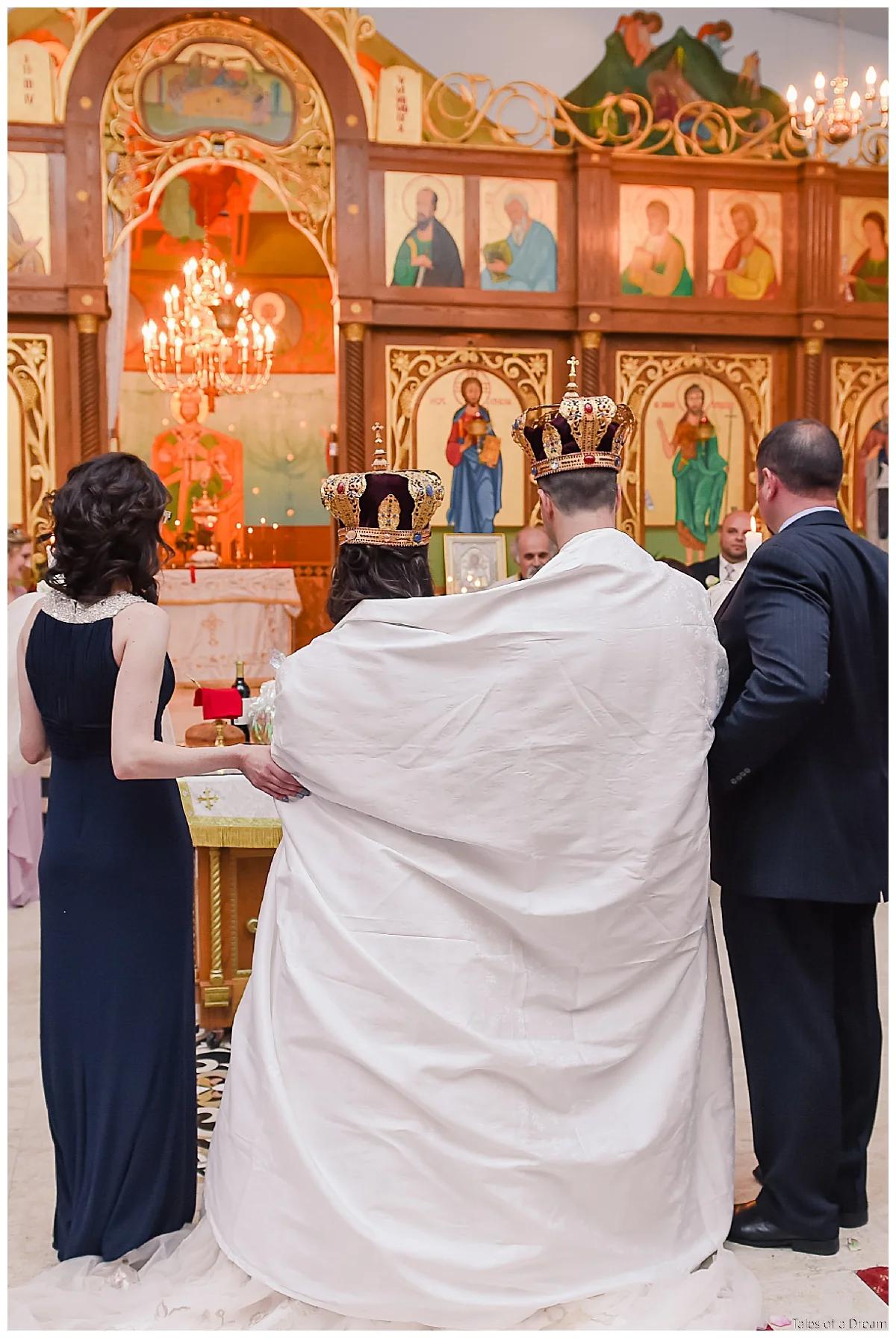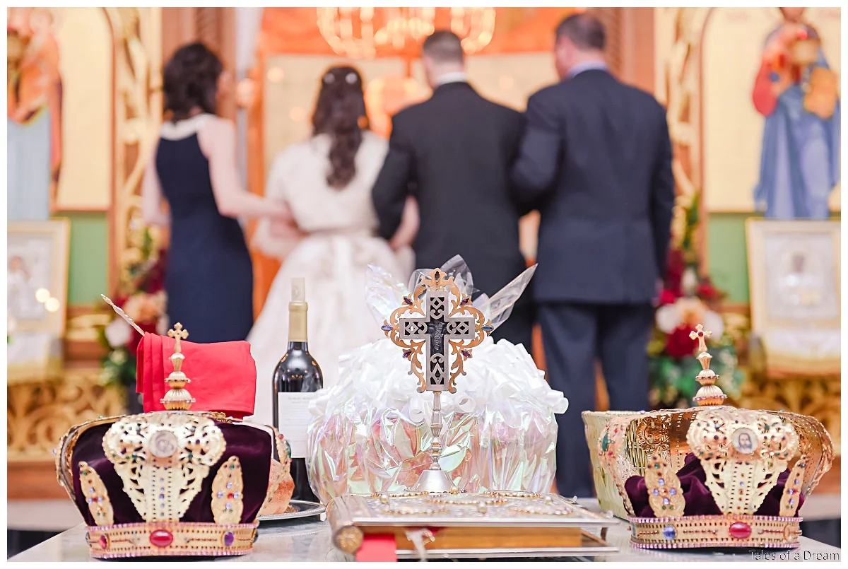 The “Crowning,” in which crowns or wreaths [customs vary in each parish] are placed on or held above the heads of the bride and groom. This signifies that in marriage there is a certain amount of sacrifice, especially in the area of “give and take.” It also signifies that in a certain respect the bride and groom become the “king and queen” of their own “kingdom,” or family, which is an integral part of the Kingdom of God.