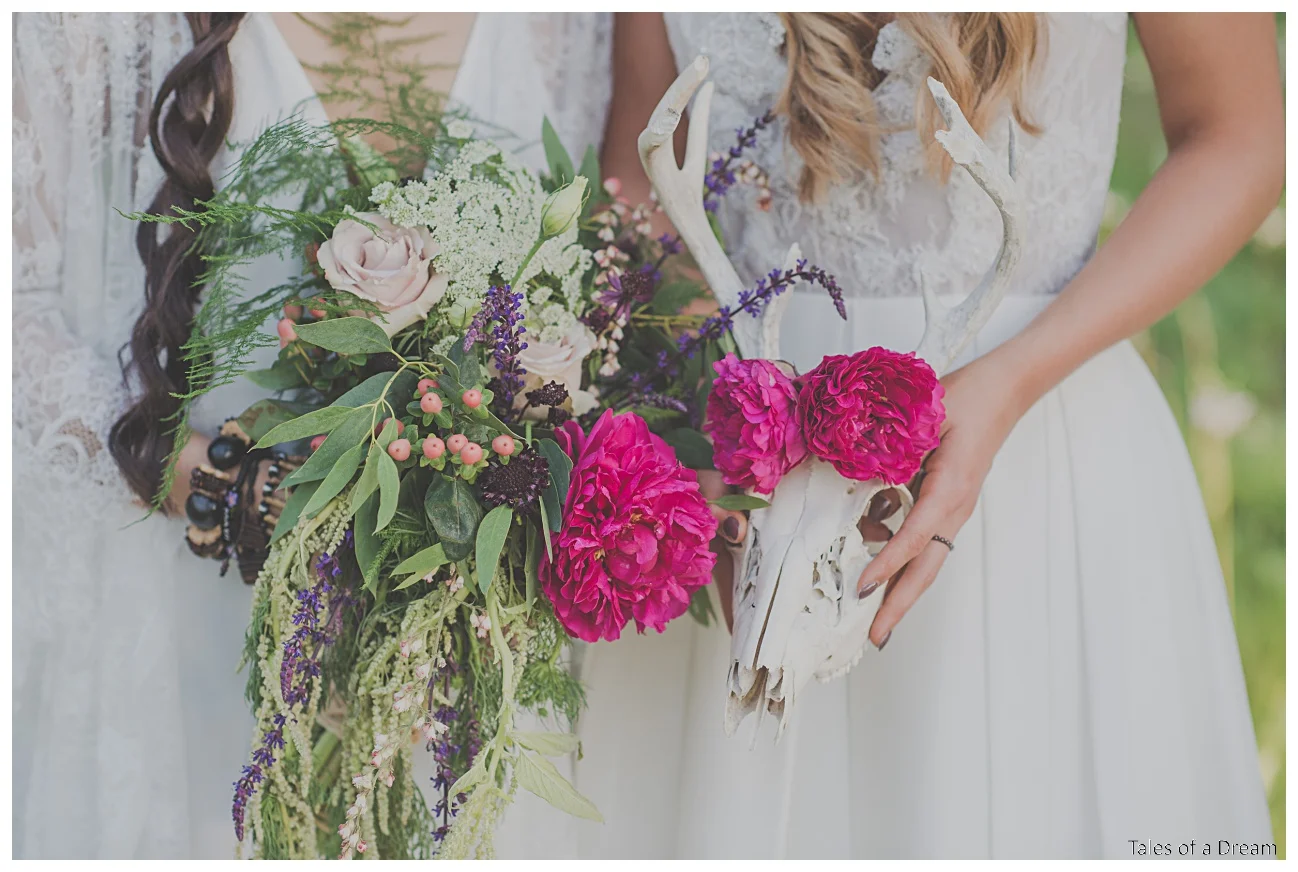And what boho bride would be complete without her flower crown? The beautiful floral arrangements, bouquet and flower crowns by Charlyn's Florals were the perfect magical element to tie everything together. When we described the concept to Charlyn, she new exactly what to do with the florals. She created a magnificent bouquet out of hanging Amaranthus, Queen Anne's Lace, Scabiosa, Peonies, Roses, Hypericum Berries and a few others.